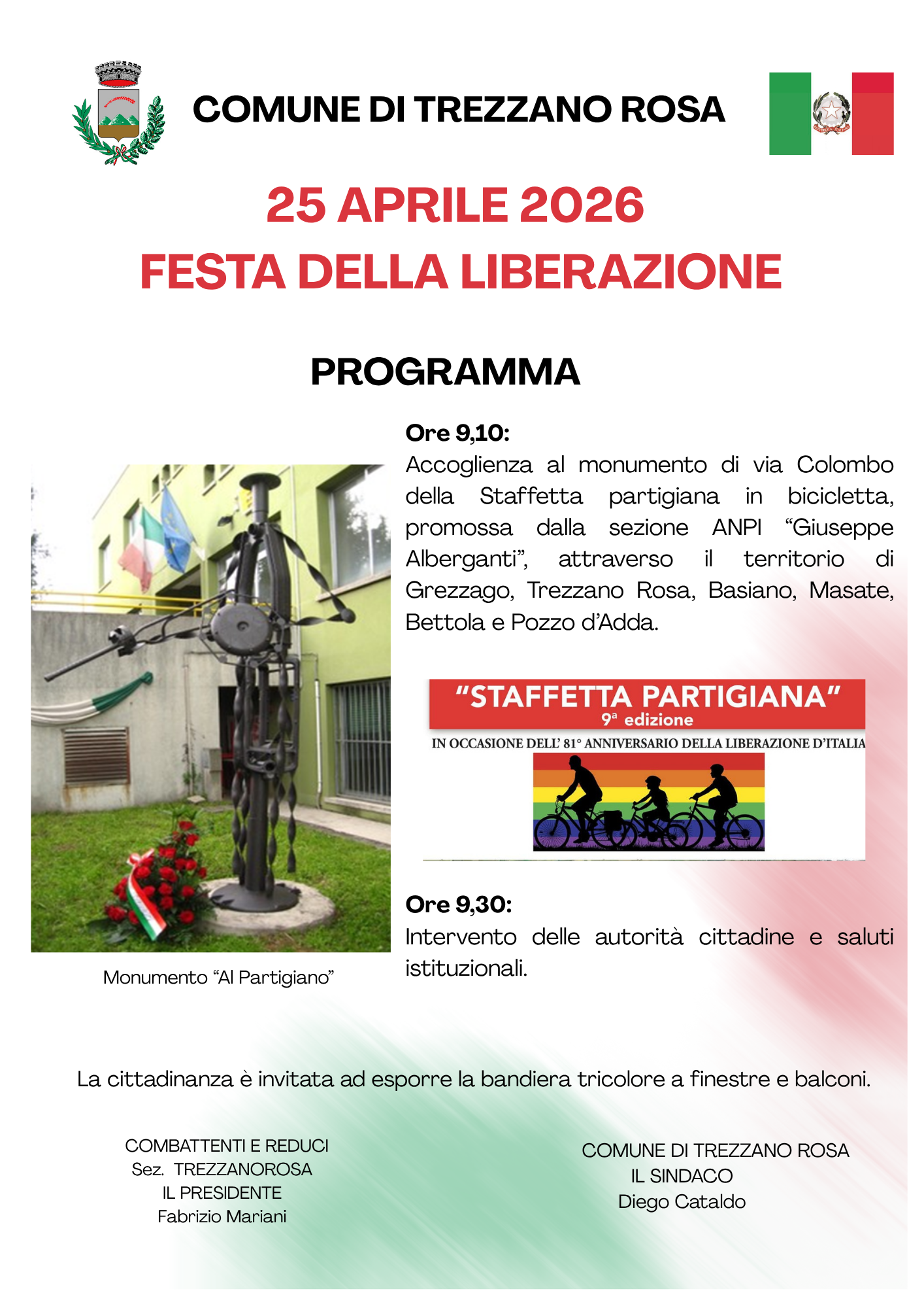 L' Amministrazione Comunale, in collaborazione con la locale Associazione “Combattenti e Reduci” nel ricordare insieme alla cittadinanza il generoso sacrificio per la liberazione dell’Italia, ribadisce il fermo e costante impegno per la difesa dei valori costituzionali di pace, giustizia sociale, lavoro e solidarietà.